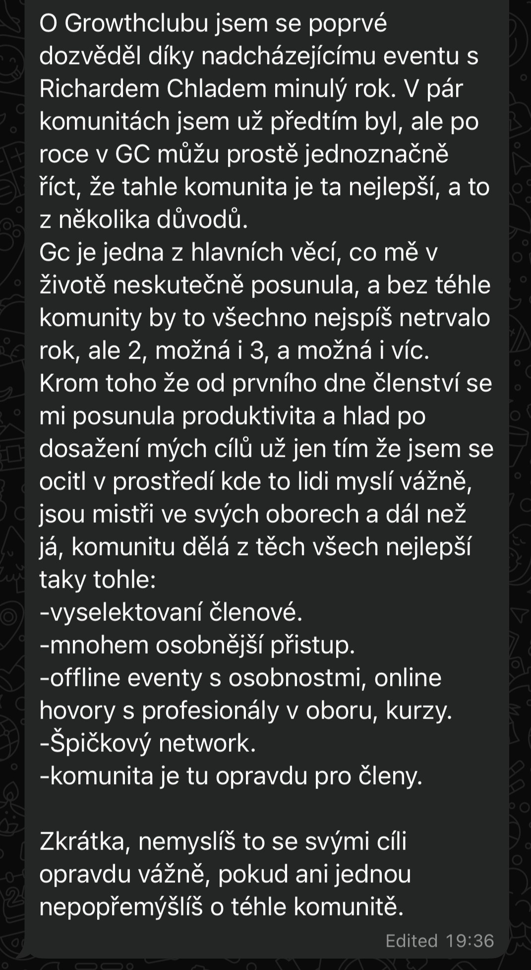 V Growth Clubu propojujeme ambiciózní muže z Česka a Slovenska, kteří mají vysoké standardy, jasné cíle a odhodlání naplnit svůj maximální potenciál, jak v byznyse, tak i v osobním životě.
